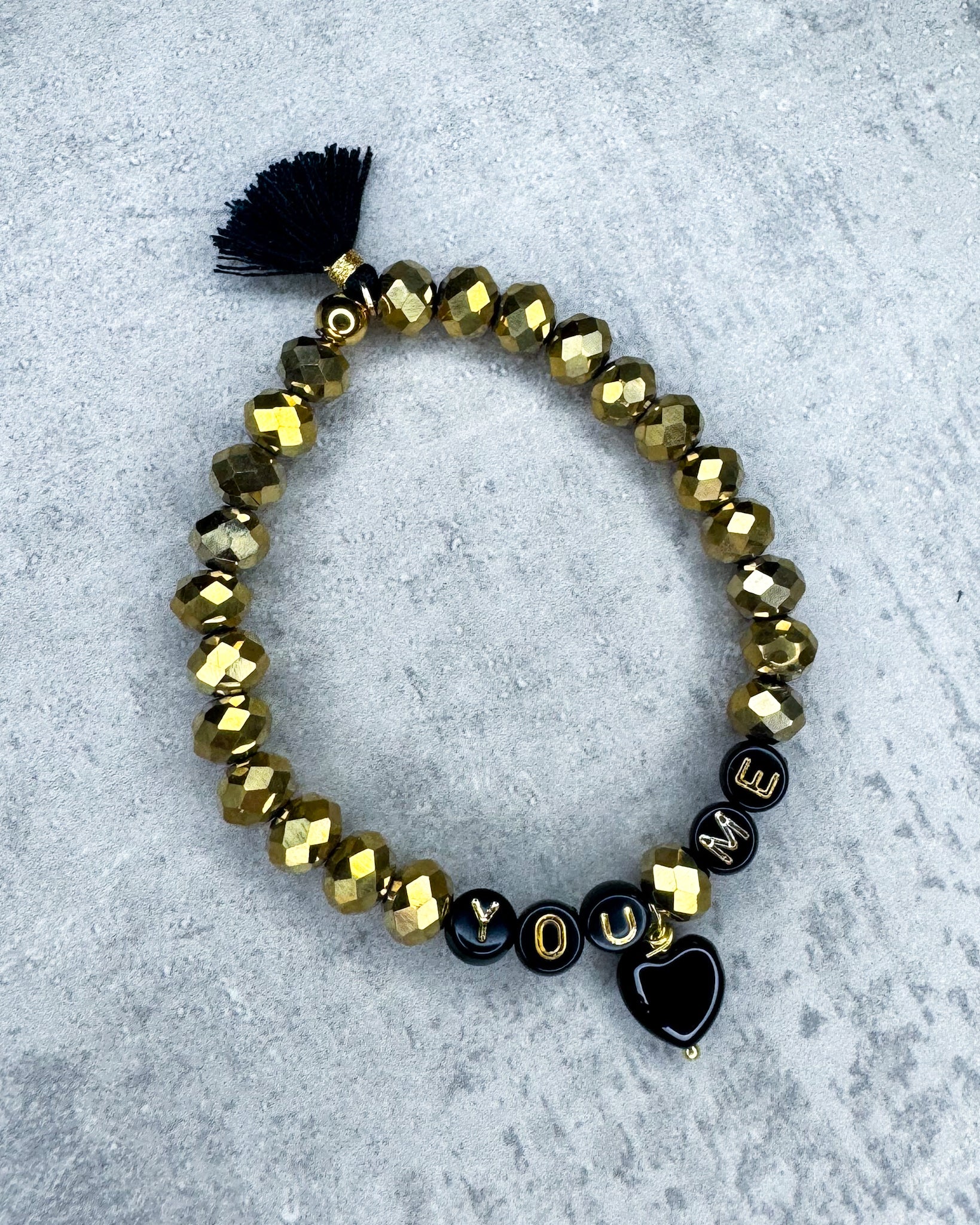 Dieses Armband ist handgearbeitet aus: goldenen, facettierten Glasperlen, schwarzen Acryl-Buchstabenperlen, einem Onyx-Herz als Anhänger, einer schwarzen Quaste und einer goldfarbenen Edelstahl-Verschlusskugel.