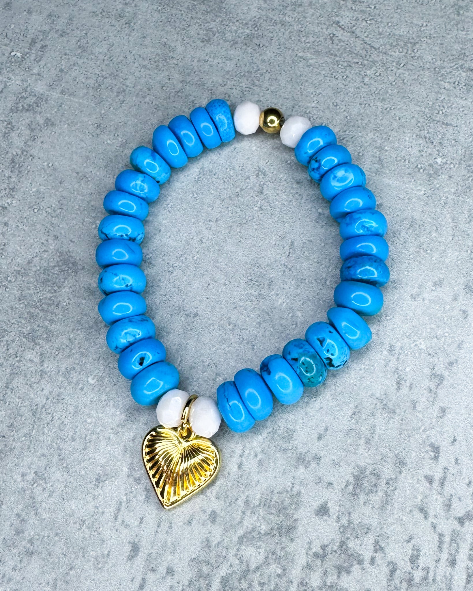 türkisen Howlith-Perlen, facettierten Glasperlen, einem Herzanhänger aus Edelstahl und einer goldfarbenen Edelstahlkugel.